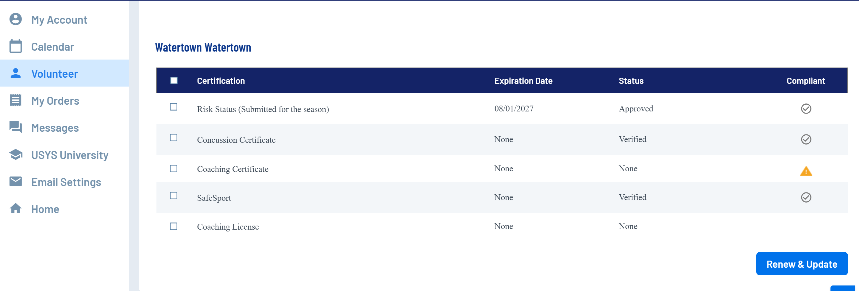2.To be able to coach you must have a check in a circle under Compliant next to Risk Status, Concussion Certificate and Safe Sport.